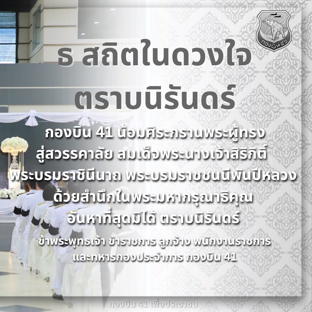 วันพฤหัสบดีที่ 30 ตุลาคม 2568 นาวาอากาศเอก ธีระยุทธ เกื้อสกุล ผู้บังคับการกองบิน 41 ร่วมพิธีบำเพ็ญกุศลสัตตมวาร เพื่อน้อมรำลึกในพระมหากรุณาธิคุณ และอุทิศถวายเป็นพระราชกุศลแด่สมเด็จพระนางเจ้าสิริกิติ์ พระบรมราชินีนาถ พระบรมราชชนนีพันปีหลวง โดยมี นายทศพล เผื่อนอุดม ผู้ว่าราชการจังหวัดเชียงใหม่ เป็นประธานในพิธี ณ ศูนย์ประชุมและแสดงสินค้านานาชาติเฉลิมพระเกียรติ 7 รอบ พระชนมพรรษา จังหวัดเชียงใหม่
