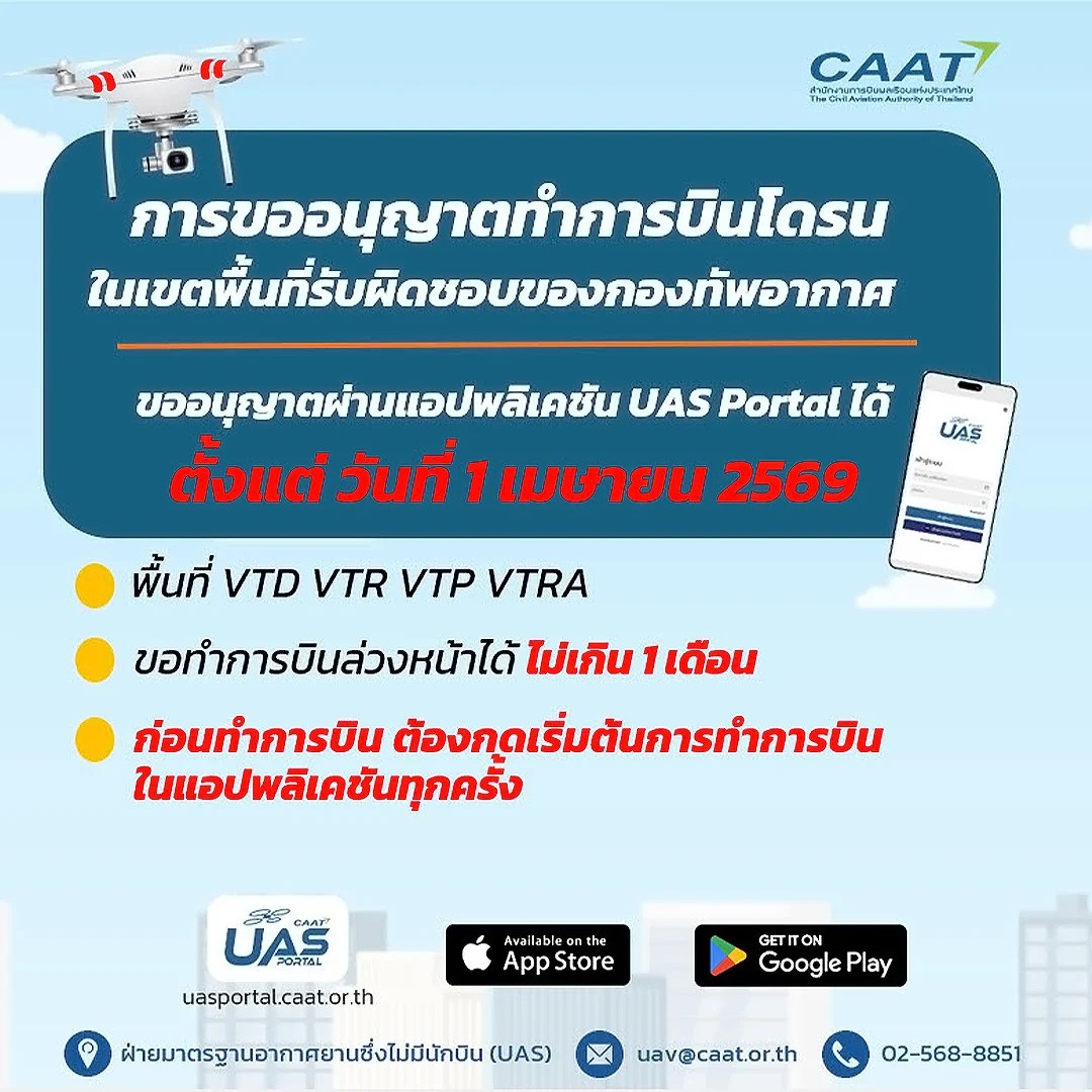 ผู้ที่ประสงค์จะทำการบินโดรนในเขตพื้นที่อันตราย VT D๔๑, VT D๔๒, และ พื้นที่ ๙ กิโลเมตร จากสามารถบิน สามารถยื่นคำขอผ่านแอปพลิเคชัน UAS Portal ได้ตั้งแต่วันที่ ๑ เมษายน ๒๕๖๙ เป็นต้นไป