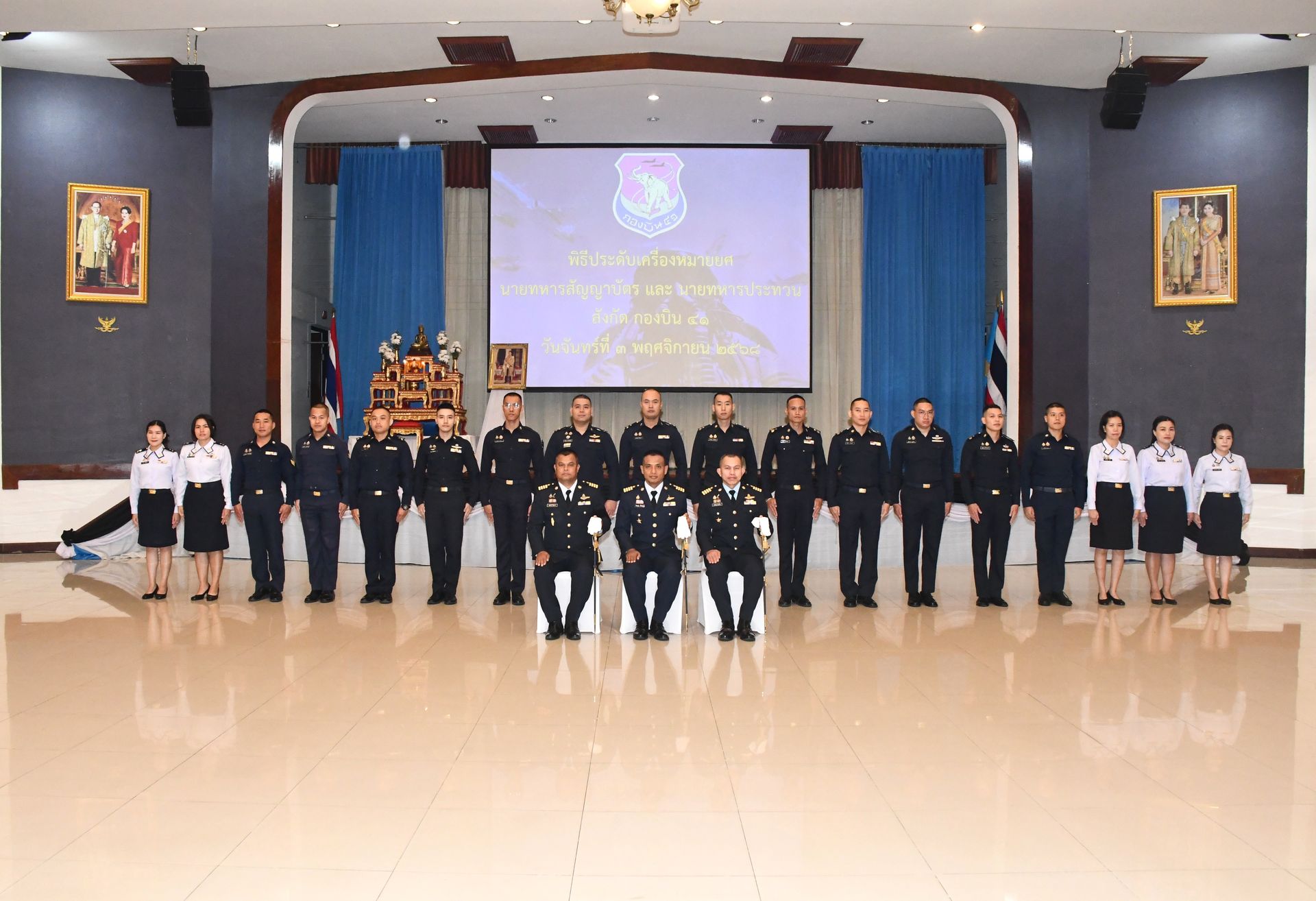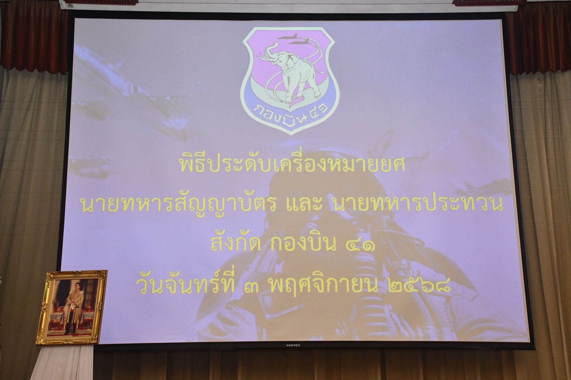 วันจันทร์ที่ 3 พฤศจิกายน 2568 นาวาอากาศเอก ธีระยุทธ เกื้อสกุล ผู้บังคับการกองบิน 41 เป็นประธานในพิธีประดับเครื่องหมายยศให้แก่นายทหารชั้นสัญญาบัตรและนายทหารชั้นประทวนที่ได้รับการแต่งตั้งและเลื่อนยศสูงขึ้น ณ หอประชุมเดชะตุงคะกองบิน 41