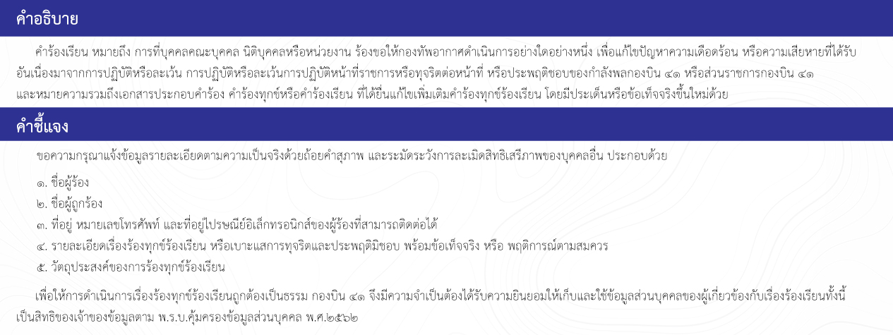 ๒. ข้าพเจ้ายินยอมให้รวบรวม จัดเก็บและใช้ข้อมูลส่วนบุคคล เพื่อประโยชน์และเป็นไปตามวัตถุประสงค์ที่แจ้ง ในการดำเนินการเรื่องร้องทุกข์ร้องเรียนของกองทัพอากาศ ภายใต้ พ.ร.บ.คุ้มครองข้อมูลส่วนบุคคล พ.ศ.๒๕๖๒ ที่กำหนด